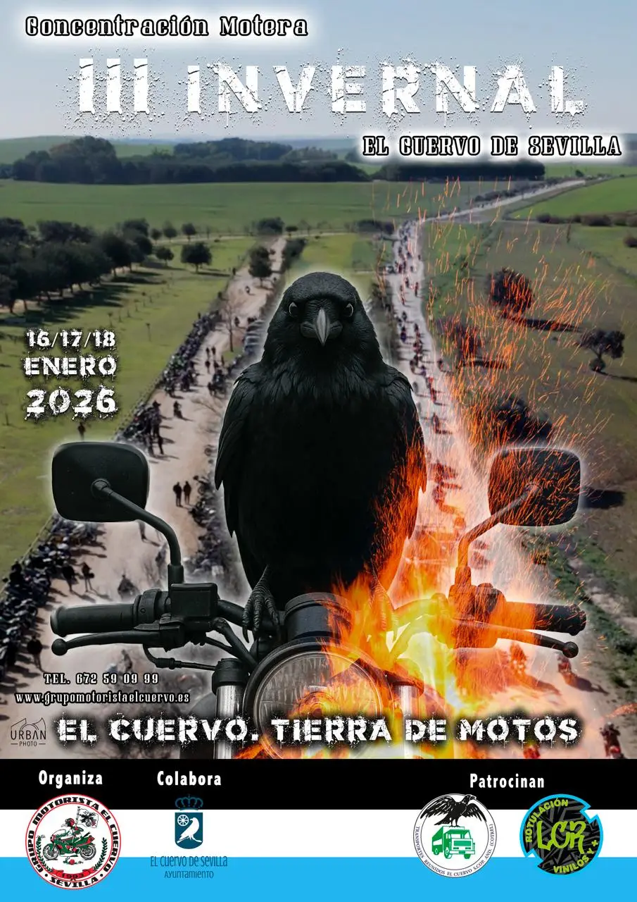 Ya tenéis aquí nuestra fecha y programación de la 3ª CONCENTRACIÓN MOTERA INVERNAL DE EL CUERVO. Nos vemos el 16, 17 y 18 de ENERO en el PARQUE ROCÍO DE LA CAMARA (El Cuervo de Sevilla)